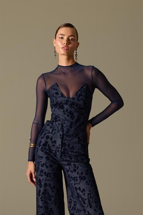 Blossom Corset, gecenin derin mavisini taşıyan kadife dokulu çiçek desenleriyle romantik ama aynı zamanda güçlü bir etki bırakıyor. Derin v formu zarif bir feminenlik sunarken arka kısmındaki fermuar detayı modern ve kusursu bir bitiş sağlıyor. Kendi desen ve kumaşındaki pantolonuyla uyum, jeanlerle cool, saten uzun eteklerle ise kusursuz görünüm oluşturabilirsin.