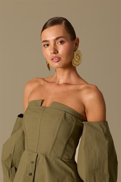Dusk Volume, çıkarılabilir kolları ve korse formlu gömlek büstiyer, hem gündüz hem akşam stiline dönüştürülebilir stilin anahtarı. Arka fermuarı ve ön düğme görünümlü detaylar modernliği klasikle buluşturuyor. Jean pantolonla, havuç kesimlerle ya da kalem eteklerle zahmetsizce şık bir uyum yakalar.