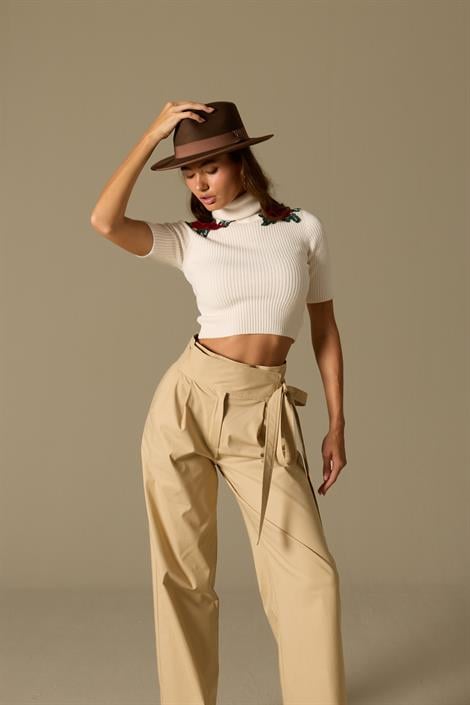 Fashionista, bel kısmındaki bağlama detayı zarif bir kemer esintisi yaratırken, dökümlü duruşu ve geniş paça formuyla güçlü ama aynı zamanda rahat bir silüet sunuyor. Yüksek bel kesimi bacak boyunu olduğundan uzun gösterirken her adımda akışkan bir hareket katıyor. Kış sezonunda boğazlı triko ve uzun akıcı bir palto ile bir araya getirildiğinde kusursuz bir şehir silüeti yakalayabilirsiniz.