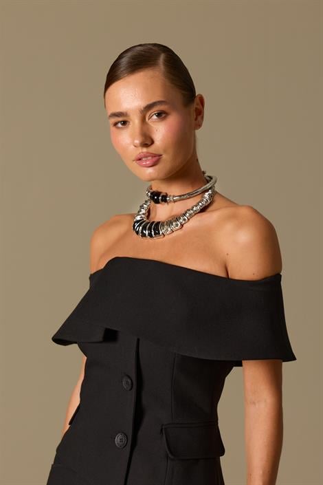 Carrie, heykelsi yakası ve kusursuz formuyla sofistike bir zaraet sunuyor. Minimal detayların gücüyle öne çıkan bu parça, tek başına bile başlı başına bir stil ifadesi. Onu tamamlayan Star Cargo pantolon ise klasik kargo çizgisine couture bir dokunuş katıyor. Birlikte giyildiğinde modern şehir kadınının hem gündüz hem gece için vazgeçilmez ikilisi haline geliyor.