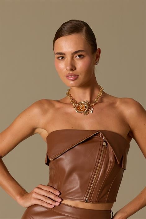 Rebel Queen, yumuşak dokulu deri kumaşı, korsaj formu ve arkasında ki bağlama detayıyla iddialı bir stil sunuyor. Straplez ve asimetrik kesimiyle gücün yansıması. Deri etek, uzun çizme ile çekici bir görünüm yakalayabilirsiniz. Jean ve ceketler ile enerjiyi yekseltebilirsiniz.