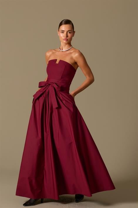 The Reform, formunu yeniden şekillendirebilme gücüyle tasarlandı. Çıkarılabilir kolları sayesinde iki farklı görünüme dönüşebilen bu elbise, asaletin modern yorumla buluşturuyor. Straplez silüetiyle baştan çıkarıcı, kollar takılıyken ise dramatik ve güçlü bir etki yaratıyor. Taşlı bir choker kolyesiyle gece şıklığını tamamlayabilirsiniz.