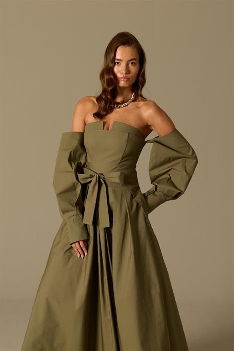 The Reform, formunu yeniden şekillendirebilme gücüyle tasarlandı. Çıkarılabilir kolları sayesinde iki farklı görünüme dönüşebilen bu elbise, asaletin modern yorumla buluşturuyor. Straplez silüetiyle baştan çıkarıcı, kollar takılıyken ise dramatik ve güçlü bir etki yaratıyor. Taşlı bir choker kolyesiyle gece şıklığını tamamlayabilirsiniz.