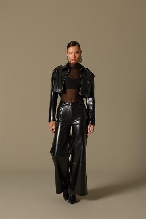 Timeless Chic Leather, deri dokusunun etkileyici parlaklığı ve geniş paça tasarımıyla modern bir duruş. Yüksek bel detayı oranları dengelerken parçaya net bir karakter kazandırır. Kısa bir üstle cesur, oversize ceketlerle zahmetsiz uyum yakalayabilirsin.